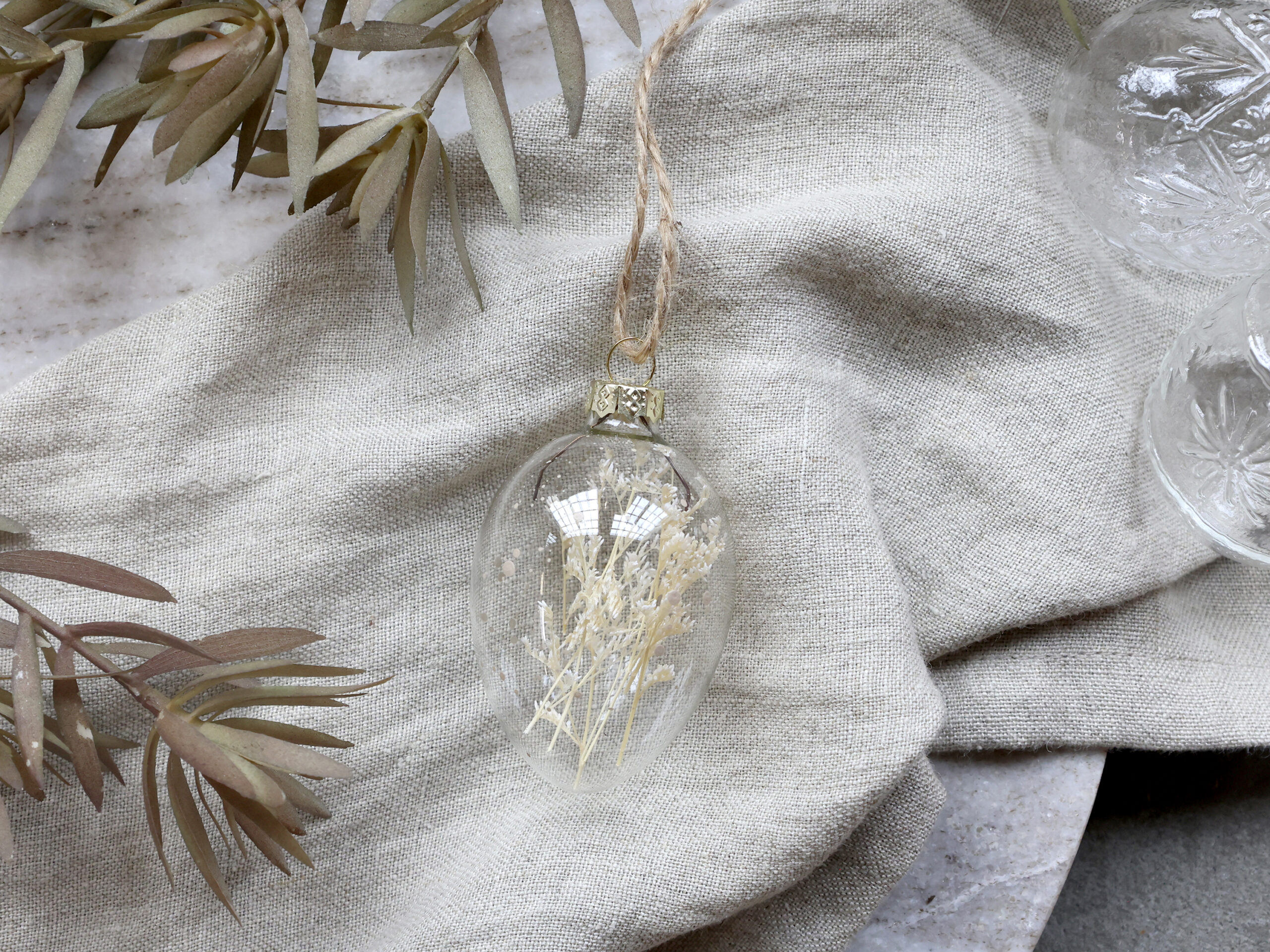 Osterei aus Glas mit getrockneten Blumen